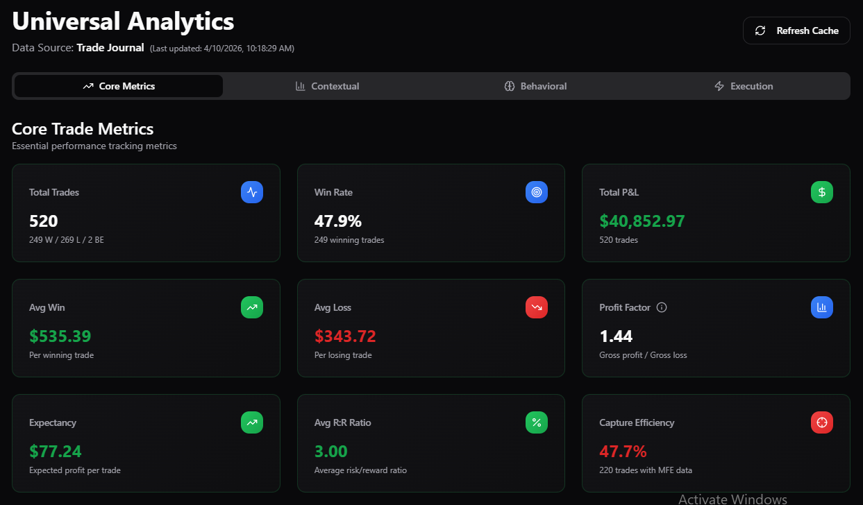 execution metrics (MFE, MAE, Capture Ratio)