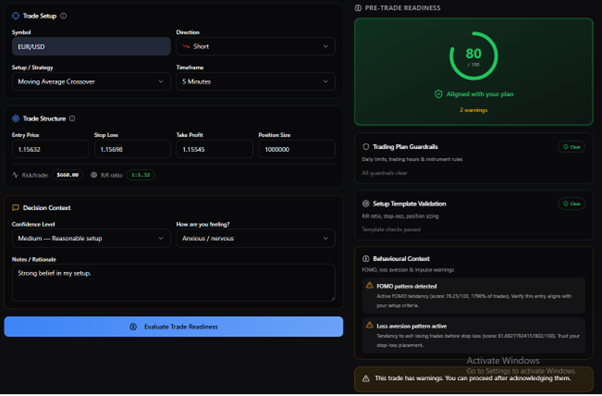 The Pre-Trade Readiness Engine evaluates planned trades against your defined trading plan, strategy templates, and behavioural signals to determine whether a decision aligns with your intended discipline.