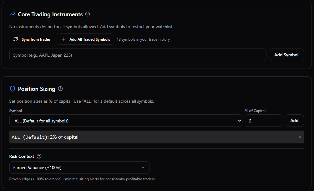 Traders can override warnings by providing a written reason, and the system later compares the planned trade with the actual execution, creating a clear accountability loop between intention, behaviour, and outcome.