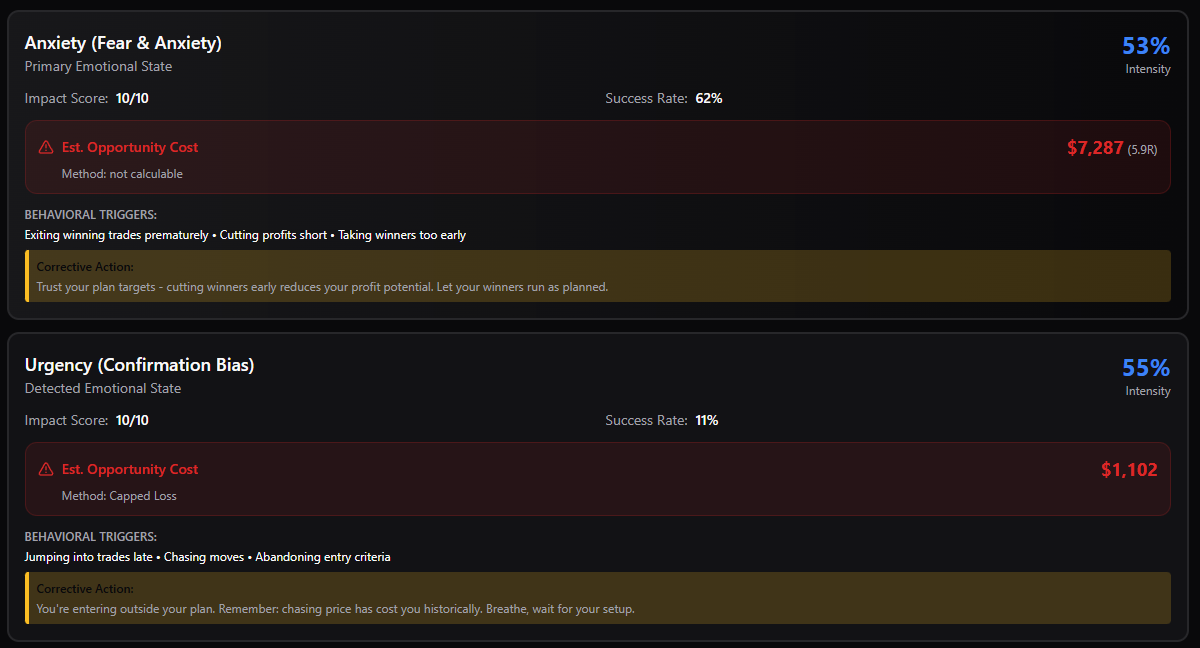 By combining MFE/MAE analysis with behavioural detection, the platform shows: