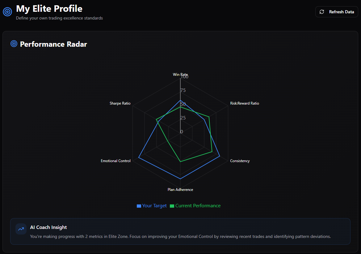 Traders define and track their own Elite Profile — a personalised performance benchmark based on: