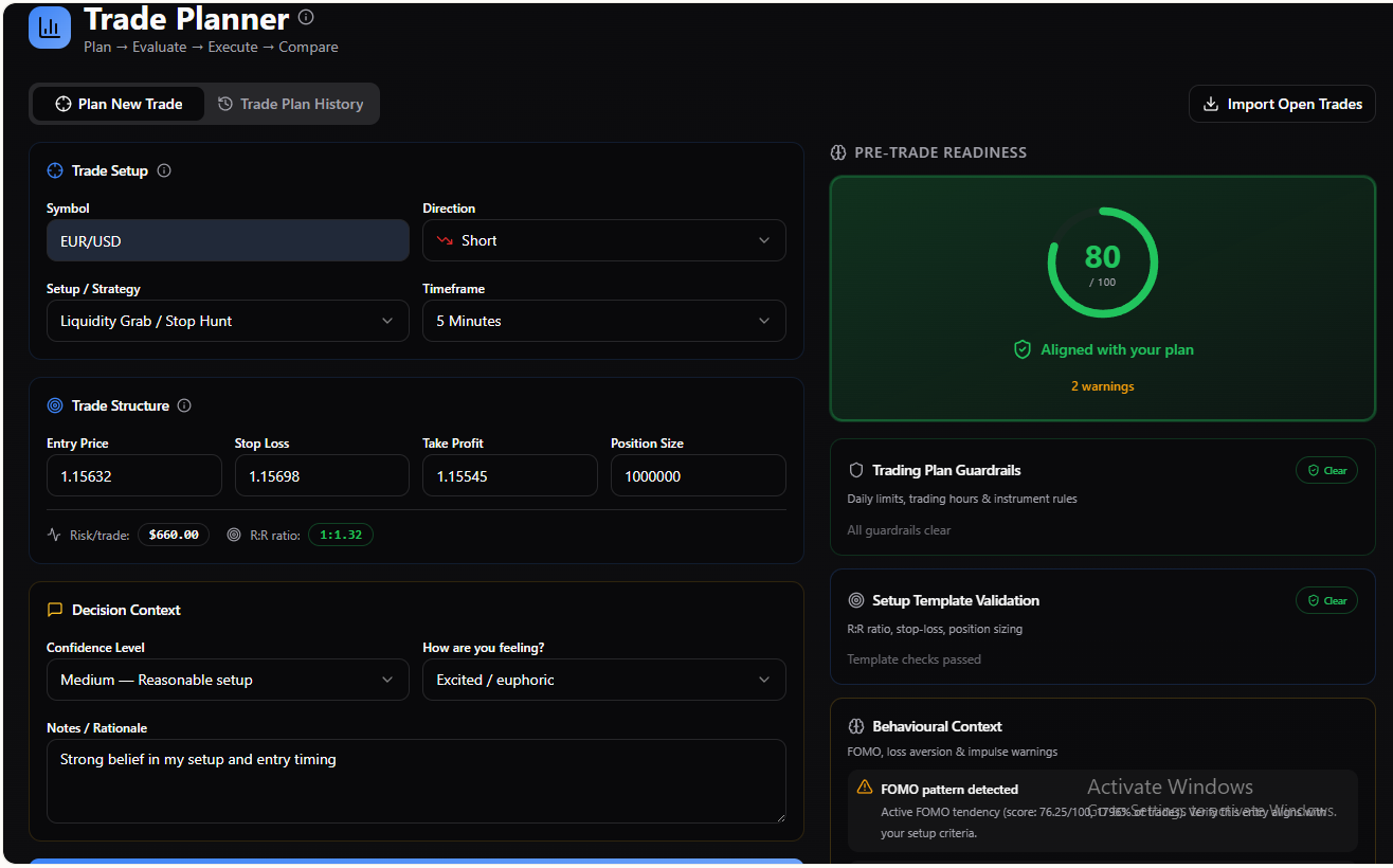 Every trade is scored for readiness—so you know whether you’re executing with discipline or reacting under pressure.