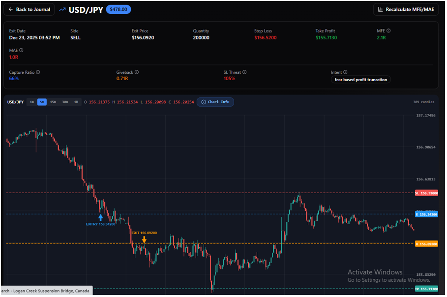 Every trade is reconstructed against real price action—showing entry, exit, stop loss, and how price actually moved while you were in the trade.