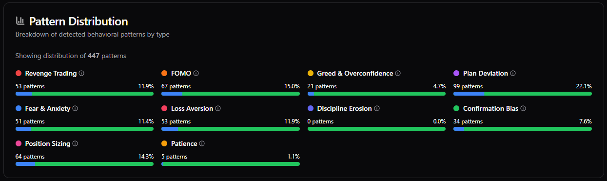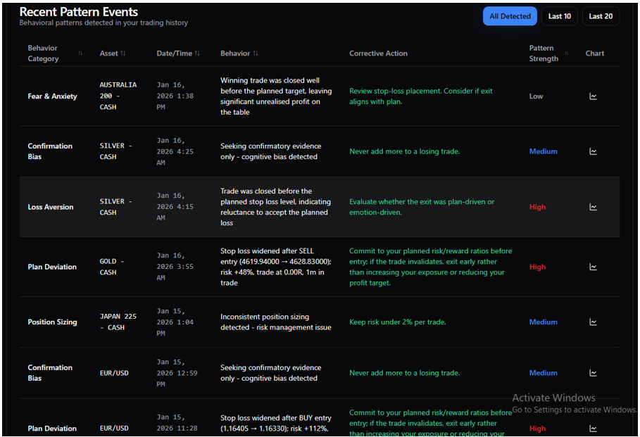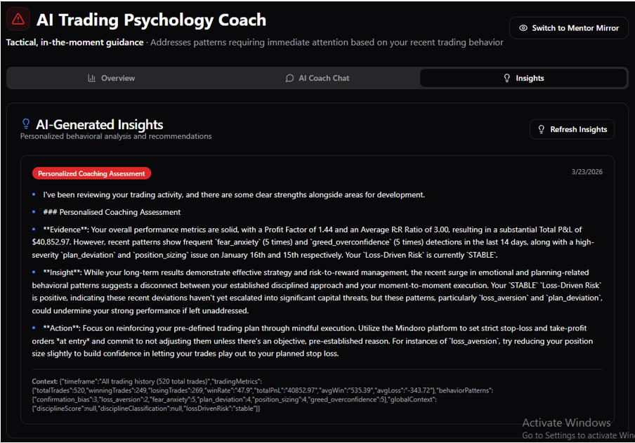 Mindoro identifies recurring behavioural patterns such as FOMO, hesitation, revenge trading, and plan deviation—then links them directly to your trading outcomes.