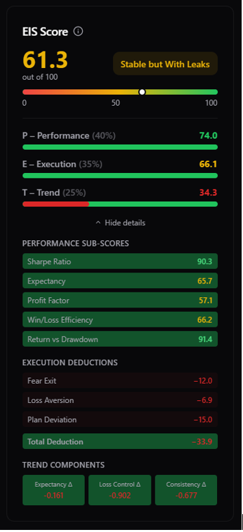 A composite score that reflects how closely your trading aligns with your plan, your risk rules, and your behavioural discipline.