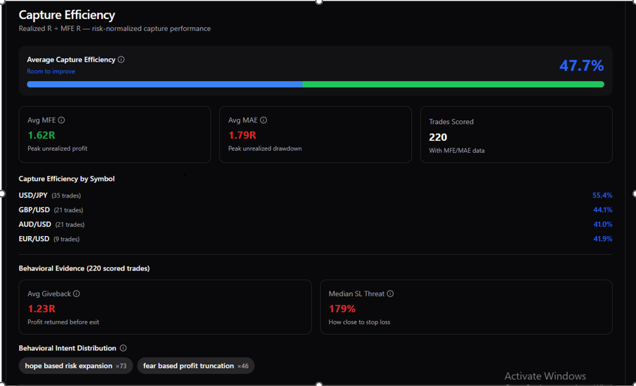 Mindoro quantifies how efficiently you convert opportunity into profit—highlighting premature exits, profit give-back, and how close your trades came to invalidation.